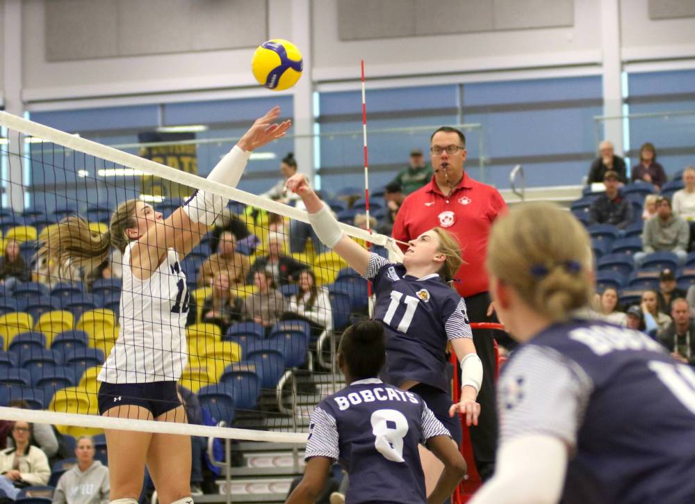The Bobcats held their own early, leading 8-6 before a back-breaking run. They hit into two blocks, hit it out twice, then added one more miss of each variety on an eight-point Cougars run.