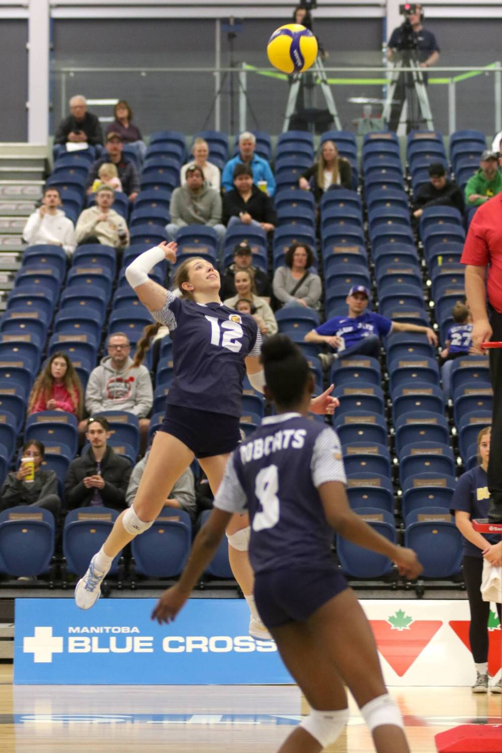 Brandon's Steph Miller attacks during the fourth set. (Thomas Friesen/The Brandon Sun)