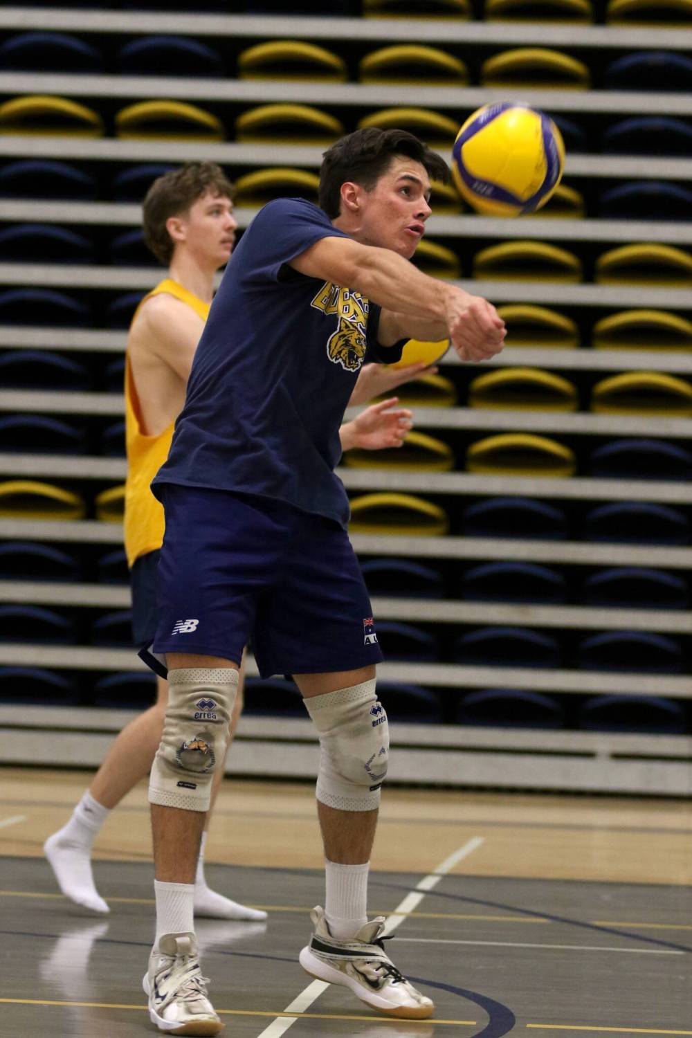Brandon University libero Cooper Bevan passes a ball after men’s volleyball practice at the HLC on Thursday. (Thomas Friesen/The Brandon Sun)