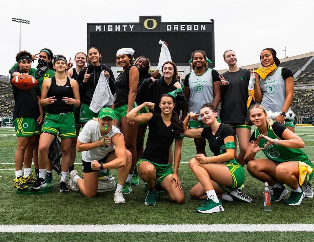 Britt Wiebe, front left, and the Oregon Ducks women’s basketball team pose after the team’s “stadium finisher” workout at Autzen Stadium during the summer. (Submitted)