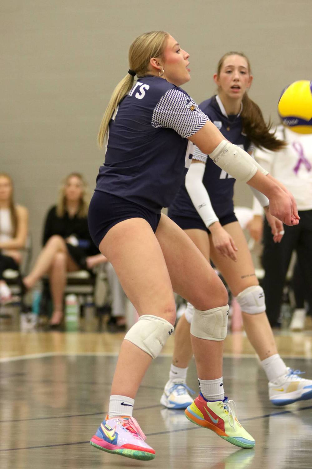 Brandon's Brynn Wildeboer passes during the third set. (Thomas Friesen/The Brandon Sun)
