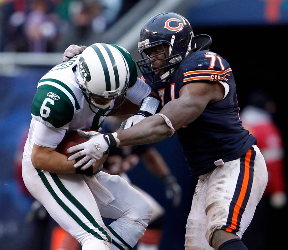 Chicago Bears defensive tackle Israel Idonije (71) pressures New York Jets wide receiver Brad Smith (16) at Soldier Field in Chicago, Ill., in 2010. (Nuccio DiNuzzo/Chicago Tribune)
