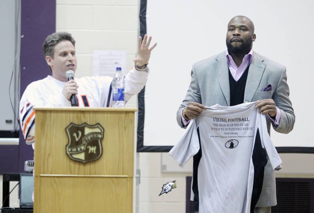 National Football League player and Vincent Massey High School alumni Israel Idonije receives a Viking football jersey from Vincent Massey teacher and football coach Kevin Grindey after addressing students from his former high school as well as visitors from J.R. Reid, Meadows and Linden Lanes schools in the gymnasium at VMHS in March 2011. Idonije took questions from the audience and signed hundreds of autographs for students. (Tim Smith/Brandon Sun)