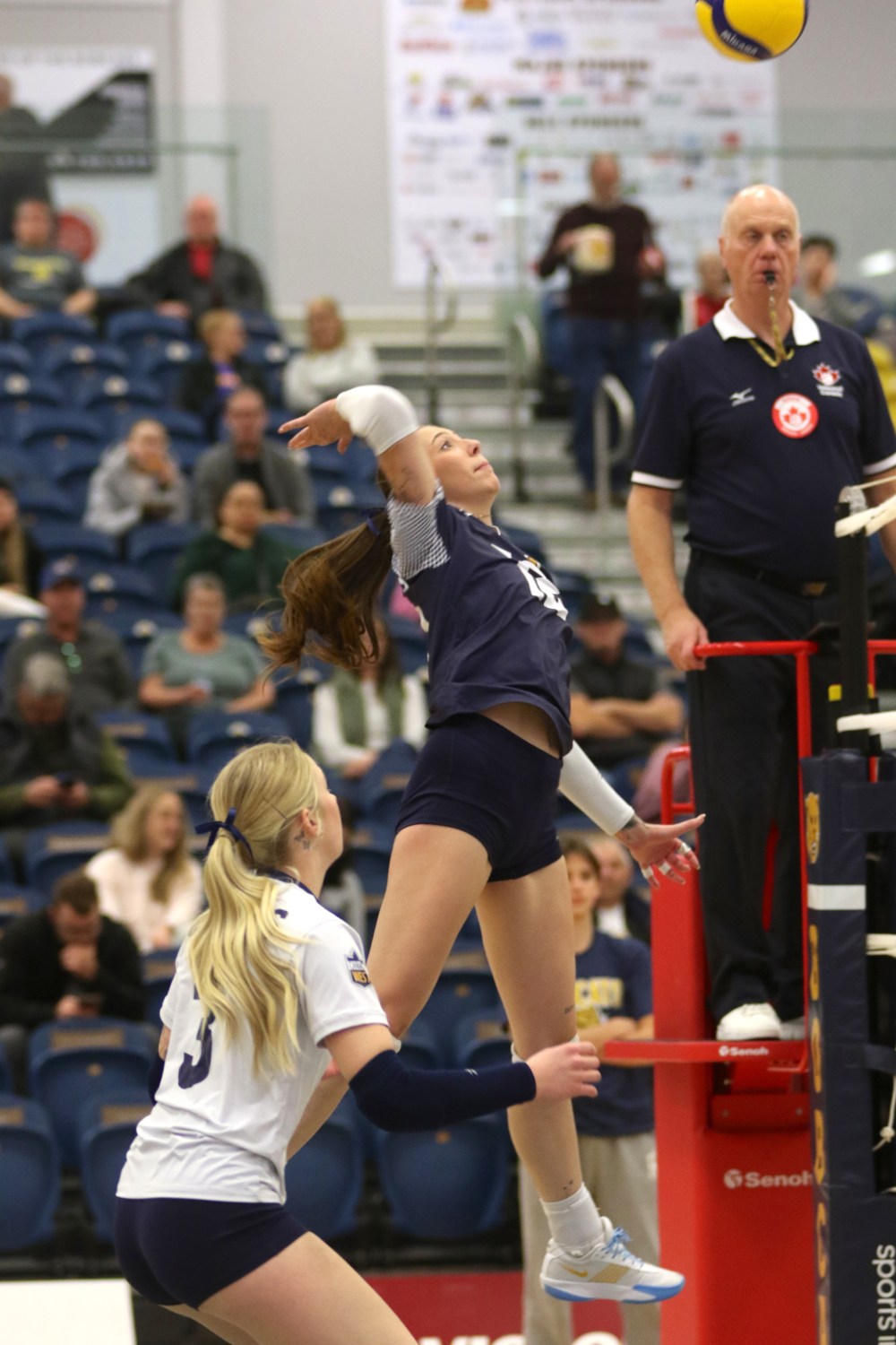 After the break, the visitors passed perfectly to let setter Hayden Hagel feed anyone she wanted. At first, it worked to stretch the lead to 12-8, but then Maddy Hettinga served a huge five-point run, including an ace after UBCO’s second timeout to pull ahead 13-12.