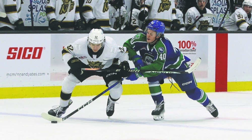 In a battle of Western Hockey League rookies, Brandon Wheat Kings Nigel Boehm (12) duels with Swift Current Broncos forward Jack Clark (40) of Wawanesa at Westoba Place on Oct. 5. (Perry Bergson/The Brandon Sun)