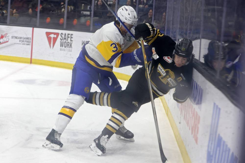 ICINGS: Brandon skated without injured D Merrek Arpin, D Adam Hlinsky, F Ryan Boyce, F Easton Odut and F Jaxon Jacobson … Saskatoon’s scratches included D Tristen Doyle … Defensive callup Luke Dumas, 15, of Beaverlodge, Alta., made his WHL debut for Saskatoon … Brandon’s Gunnar Gleasman threw a heavy hit when he thundered Saskatoon forward Ben Bowtell with a heavy hit in front of the Blades net as they broke out, and later in the first period Hadland caught Kazden Mathies with his shoulder and sent the Martensville product flying… When Petr’s stick got knocked out of his hands late in the third period and he went to the bench, Ruzicka carefully placed it on top of the net to get it out of his way … Carter Klippenstein led the Wheat Kings with six shots on net … The game took two hours, 27 minutes to play … In the faceoff circle, Brandon won 35-34 … The Wheat Kings visit the Regina Pats on Friday at 7 p.m., and host the Moose Jaw Warriors on Saturday at 6 … Scammers have been reaching out to local businesses pretending they are from the Wheat Kings. If anyone receives a suspicious email or phone call purportedly from the team, they’re asked to call the office to double-check it’s legitimate … The Prince Albert Raiders acquired 19-year-old forward Maddix McCagherty of Kelowna, B.C., from the Wenatchee Wild on Wednesday for a fourth-round pick in 2026 and a sixth-round pick in 2027. Also Wednesday, the Seattle Thunderbirds traded 17-year-old forward Colton Gerrior of Williams Lake, B.C., and a seventh-round pick in 2026 to the Vancouver Giants for a fifth-round pick in 2026 and a fourth-round pick in 2028.
