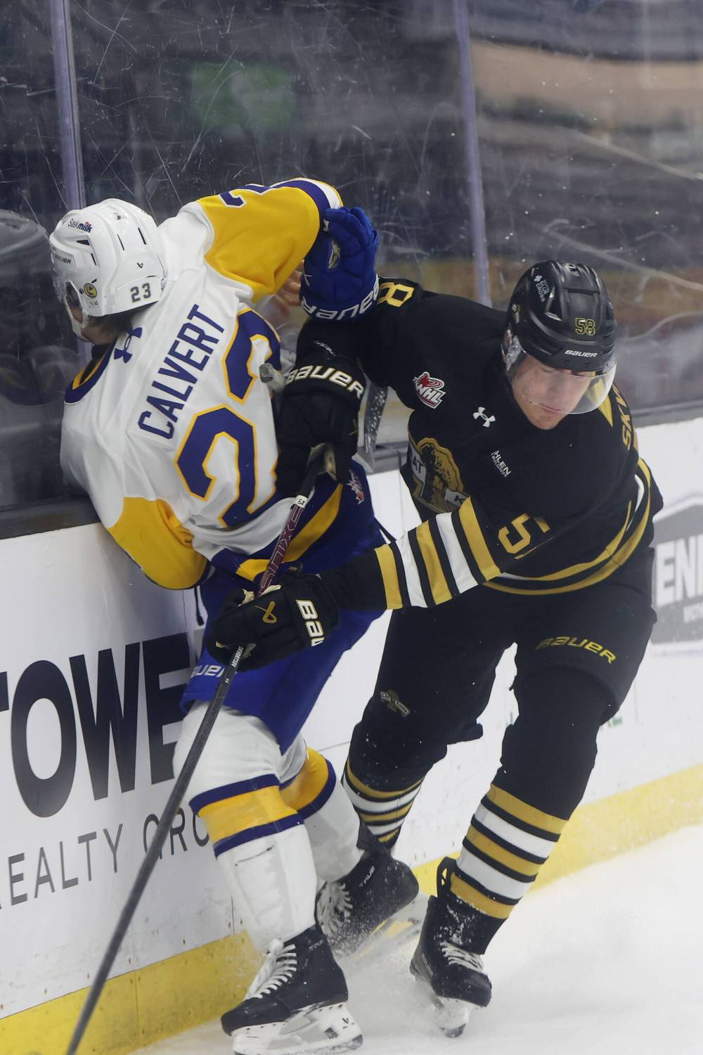 Brandon’s Daniil Skvortsov (58) hammers Rowan Calvert (23) into the boards. (Tim Smith/The Brandon Sun)