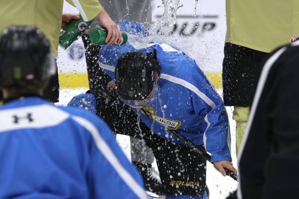 At practice on Thursday, Jacobson was at centre ice, and when he wasn’t looking, he got an impromptu water bottle shower from some of his teammates to celebrate his 17th birthday, which drew loud laughter from the entire group.