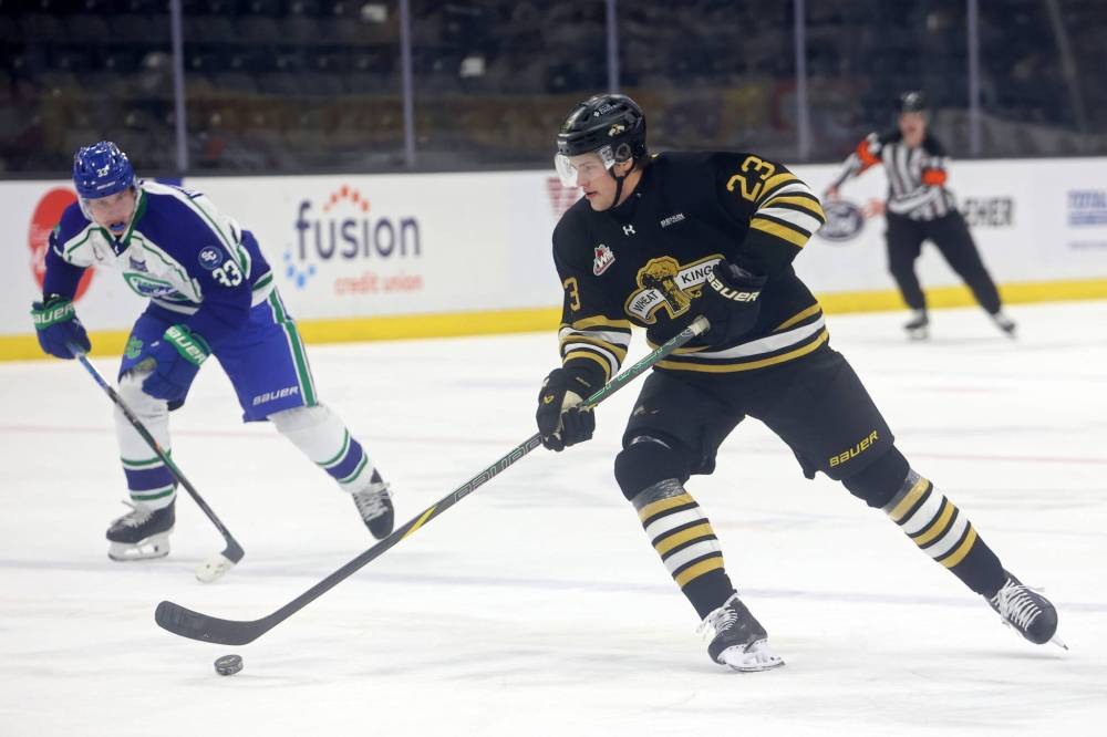 Gunner Gleasman of the Brandon Wheat Kings plays the puck on Nov. 5. The Colorado product adds a physical element to the lineup. (Tim Smith/The Brandon Sun)