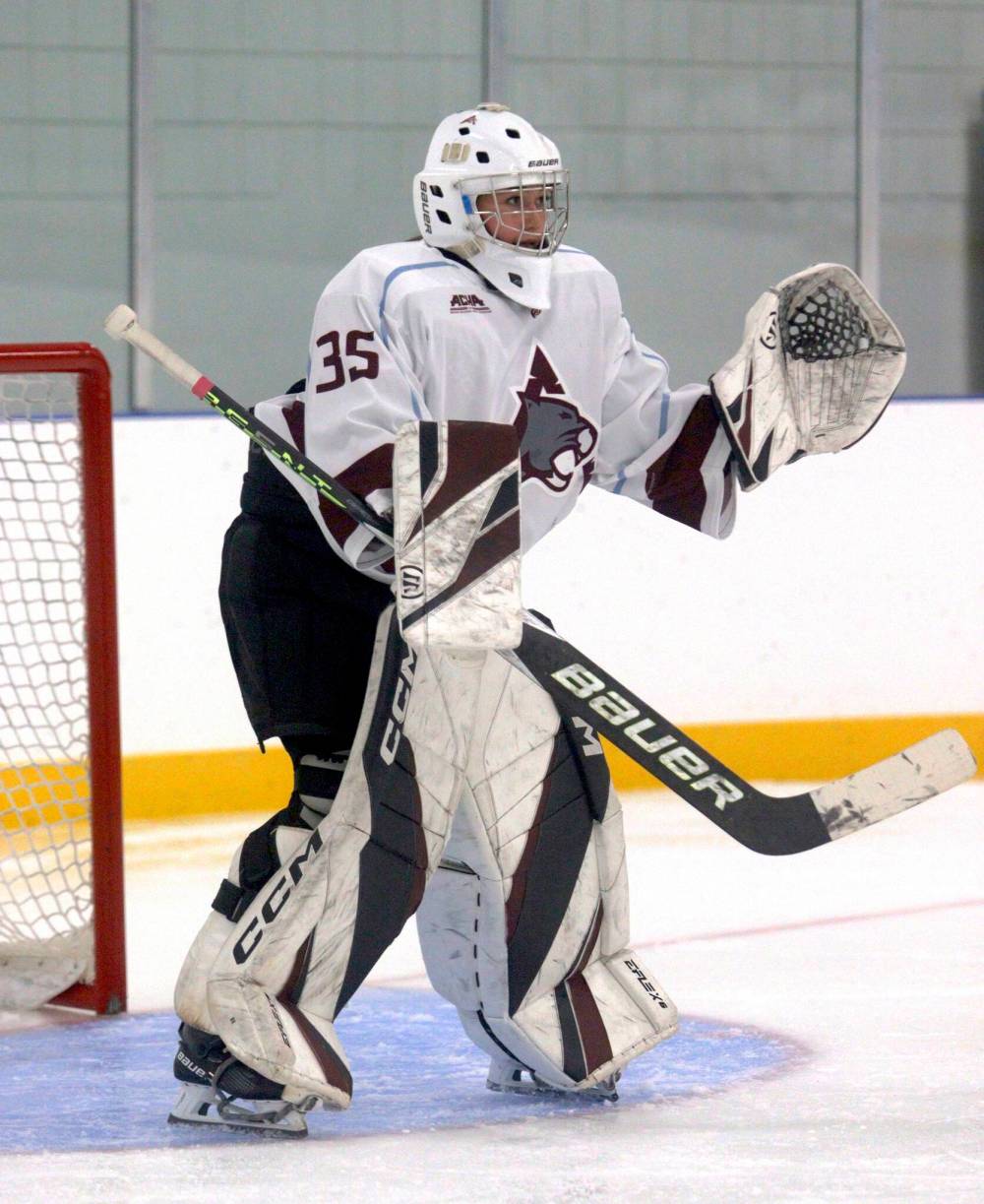 Rachel Halldorson (35) notched a 1.06 goals against average and a .963 save percentage during her first year with the Assiniboine College Cougars last season, earning herself an ACHA Division 2 first team all-star nomination. She’s posted a 9-0 record to go along with a 0.81 goals against average and a .965 save percentage so far this year. (Massimo De Luca-Taronno/The Brandon Sun)