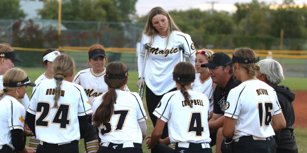 Alexa Banga of the under-15 Westman Magic is on crutches as her teams meets after a game during Softball Canada's under-15 national championship at Ashley Neufeld Softball Complex in 2023. She has recovered from the devastating injury. (Perry Bergson/The Brandon Sun)