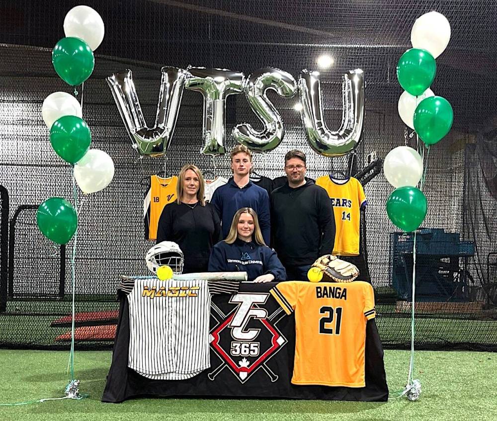 Virden softball player Alexa Banga signs her commitment papers to Vermont State University Castleton in December at the Triple Crown Sports indoor facility in Brandon under the watchful eyes of mother Nicky, brother Liam and father Darin. (Submitted)