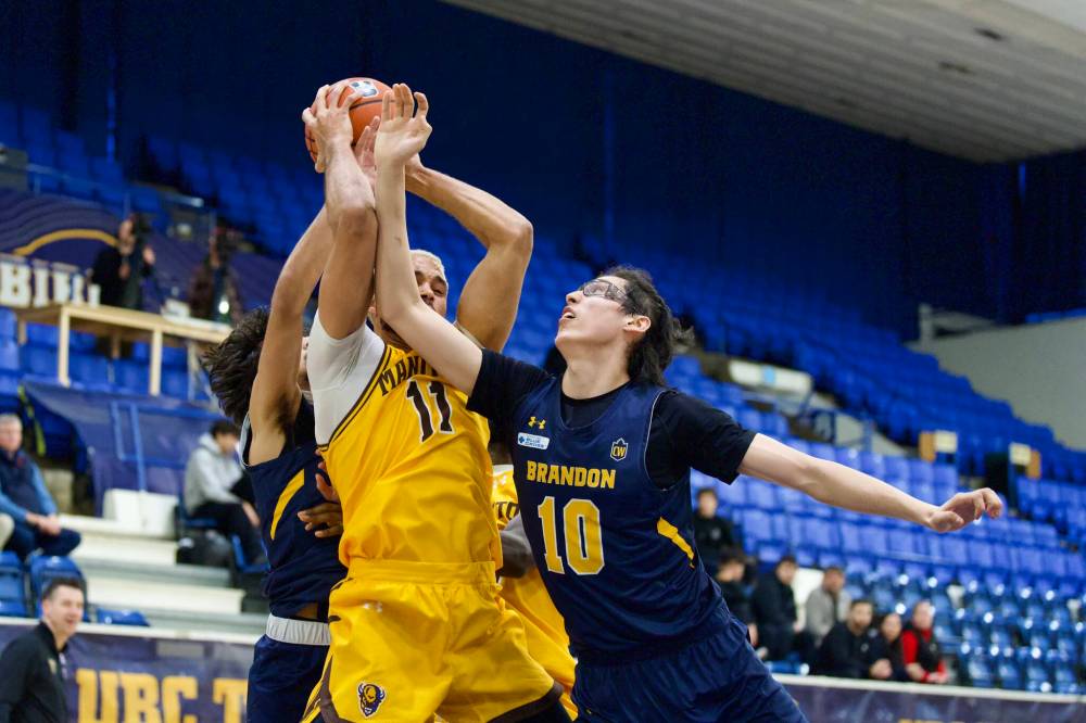 Brandon’s Max Winters tries to rebound as Manitoba’s Cieran O’Hara brings it down during the first round of the Canada West men’s basketball playoffs in Vancouver on Thursday. (Vamsi Nadella/UBC Thunderbirds)