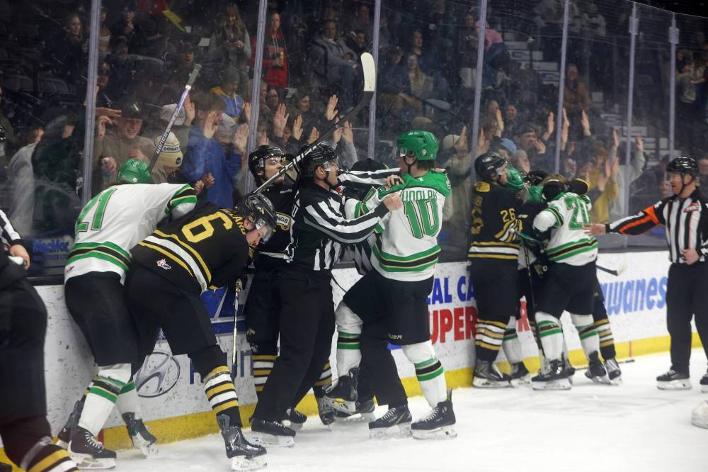 The whistle had just blown with Brandon in control of the puck after a pair of Daxon Rudolph cross checks along the boards, which quickly erupted into a 10-player melee that didn’t include any actual fights. Even Kraus skated to centre ice, perhaps looking for Bass to join him.