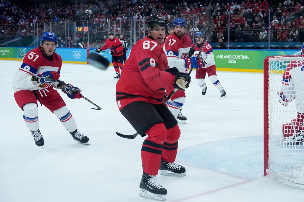 Canadian captain Sidney Crosby (87) and Czech defencemen Radim Simek (51) and Filip Hronek (17) watch the puck bounce off the glass at the Winter Olympics in Milan on Wednesday, Feb. 18, 2026. THE CANADIAN PRESS/Darryl Dyck