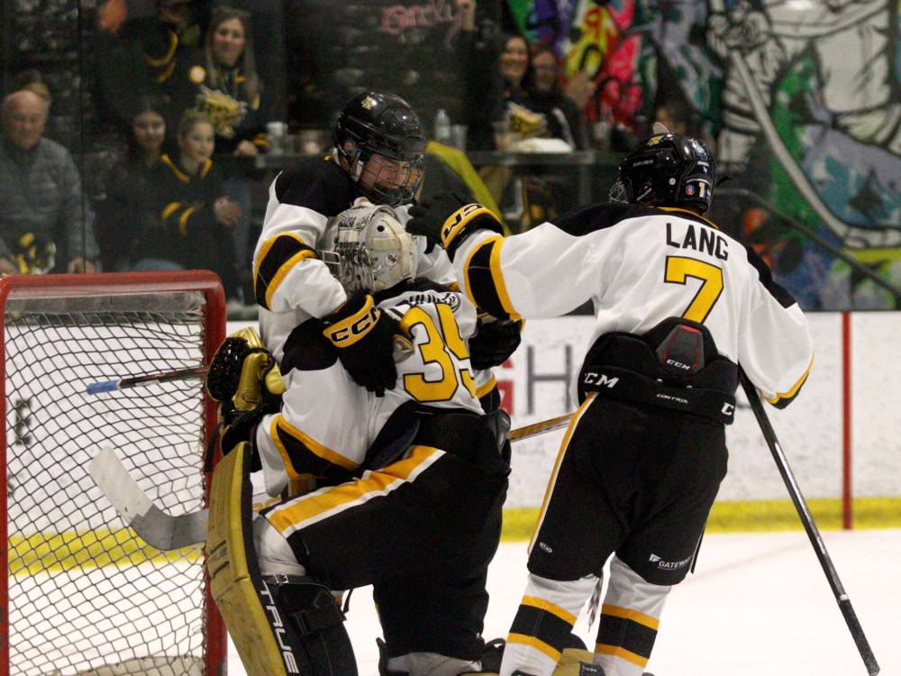 Aurick Veldhuisen (35), Jace Woloski (17) hug it out as Jordan Lang (7) comes to celebrate after the Brandon Wheat Kings defeated the Winnipeg Bruins Gold to advance to the championship against the Eastman Selects. (Massimo De Luca-Taronno/The Brandon Sun)