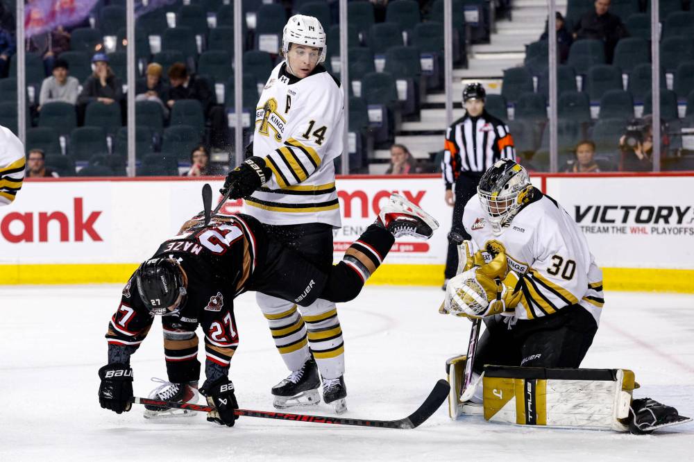 Brandon Wheat Kings goaltender Filip Ruzicka (30) makes a save as defenceman Grayson Burzynski (14) and Calgary Hitmen forward Julien Maze (27) during Game 2 of their Western Hockey League quarterfinal series at Scotiabank Saddledome on Sunday. Maze had a goal and five assists as Calgary won 6-5 in overtime. (Jenn Pierce/Calgary Hitmen)