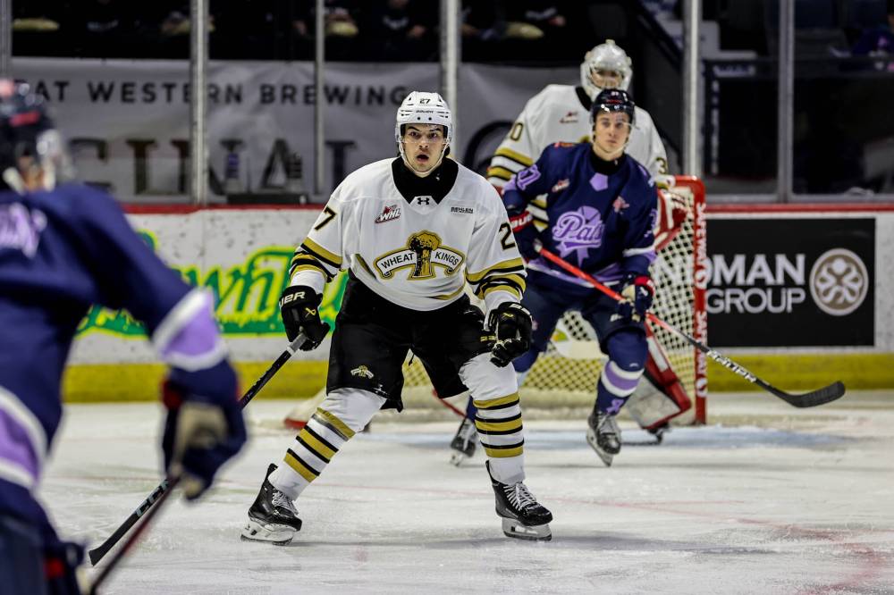 Brandon Wheat Kings defenceman Max Lavoie (27) keeps a close eye on a Regina Pats attacker during Western Hockey League action at Brandt Centre on Oct. 18. Lavoie is a defensive defenceman who takes a lot of pride in his work in his own end. (Keith Hershmiller Photography)
