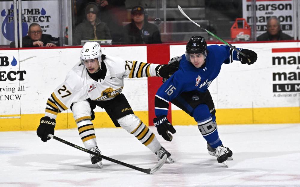 Brandon Wheat Kings defenceman Max Lavoie (27) and Wenatchee Wild forward Nolan Caffey (15) watch the play during Western Hockey League action at Town Toyota Center on Jan. 28. Lavoie’s climb through the hockey ranks continues next winter when he plays for Princeton University. (Russ Alman/Wenatchee Wild)