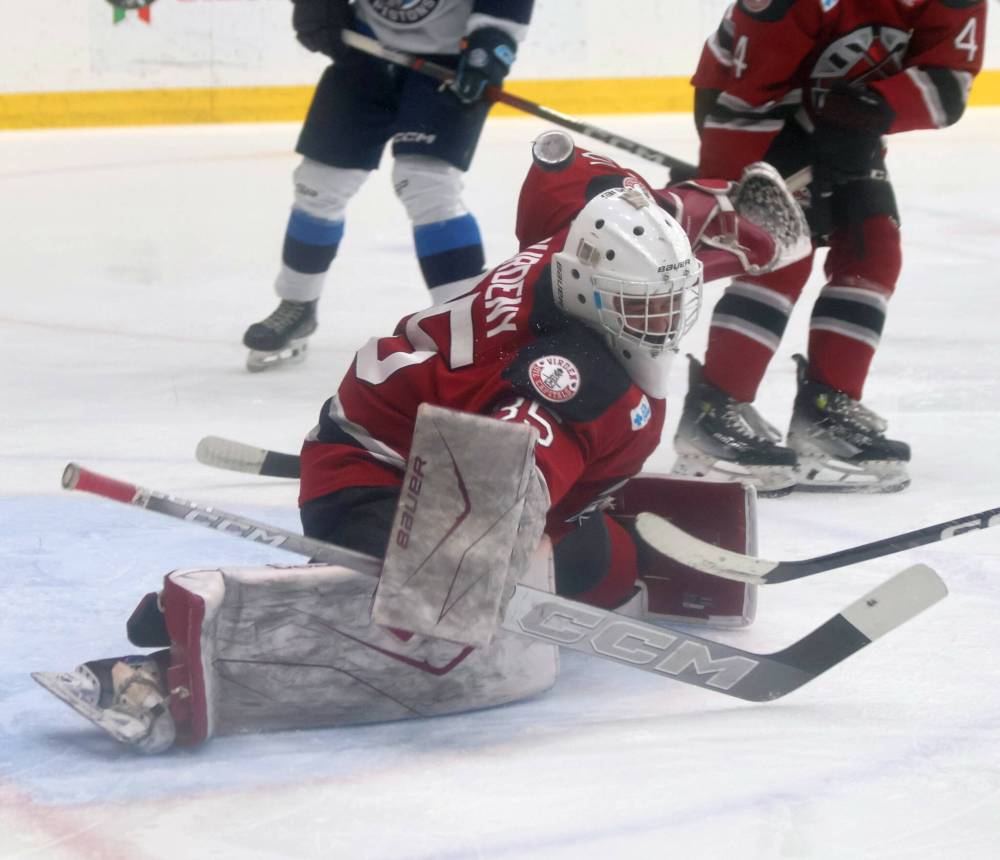 Goaltender Braxton Burdeny stretches out to make a blocker save during Game 2 action between the Oil Capitals and Pistons in the MJHL semifinals. (Cassidy Dankochik/The Carillon)