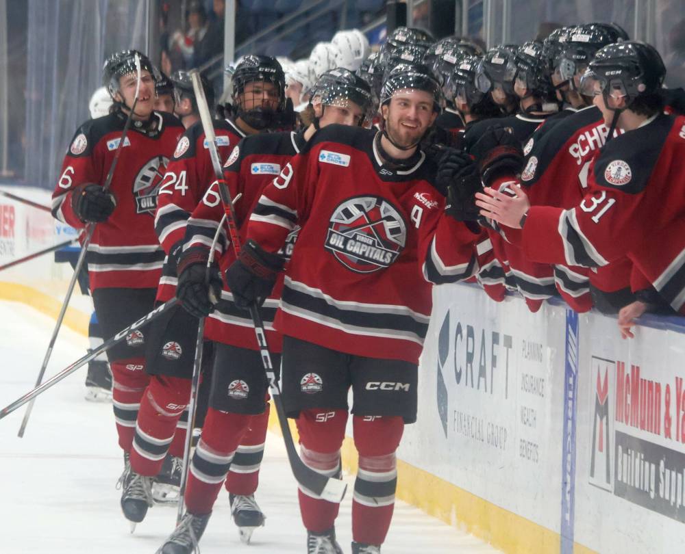 Members of the Virden Oil Capitals celebrate after netting a goal during Game 2 action in their semifinals matchup with the Steinbach Pistons at Southeast Event Centre on Saturday. Virden won 8-4. (Cassidy Dankochik/The Carillon)