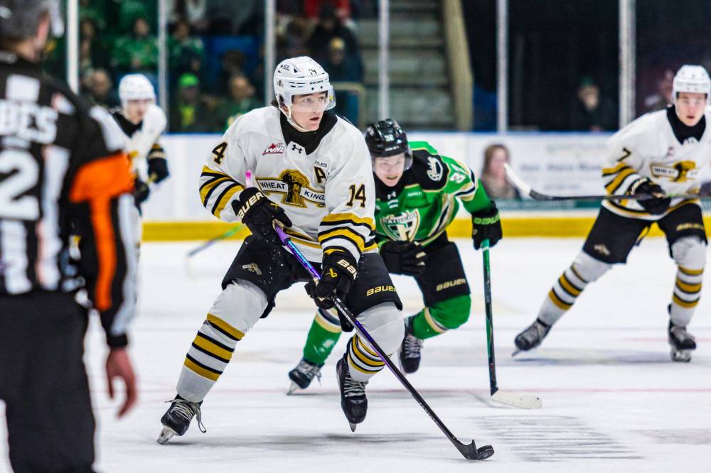 Brandon Wheat Kings defenceman Grayson Burzynski carries the puck up ice with Prince Albert Raiders forward Owen Corkish (32) in hot pursuit during Western Hockey League action at Art Hauser Centre on Feb. 7. Burzynski is happy he’ll never have to play in that old rink again. (Mark Peterson/Prince Albert Raiders)