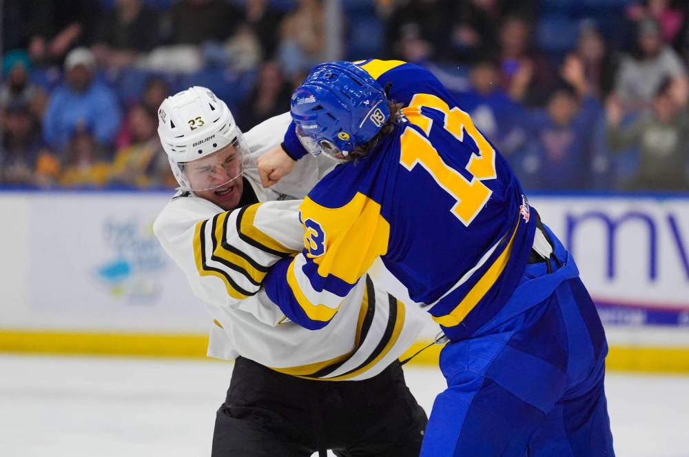 Brandon Wheat Kings forward Gunnar Gleasman (23) trades punches with Saskatoon Blades defenceman Isaac Poll (13) on Jan. 3. Gleasman brought energy, tenacity and physicality to the bottom six. (Steve Hiscock/Saskatoon Blades)