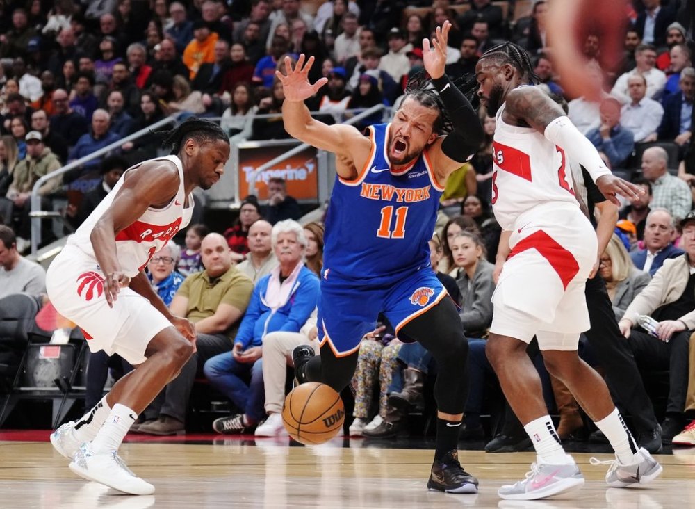 New York Knicks' Jalen Brunson (11) is fouled trying to get between Toronto Raptors' Jonathan Mogbo (left) and Jamal Shead (right) during second half NBA basketball action in Toronto on Tuesday, February 4, 2025. THE CANADIAN PRESS/Nathan Denette