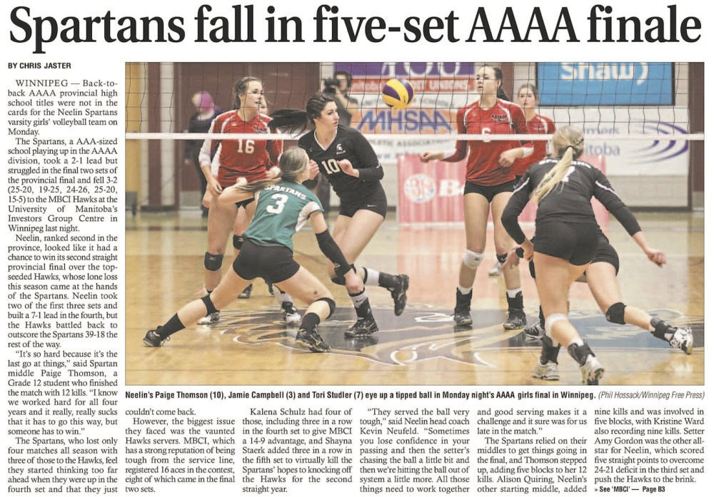 It set up the final everyone expected, a perfect rubber match of the past two years with the Mennonite Brethren Hawks. The Winnipeg squad handed Neelin its only loss in the 2011 JV gold-medal match, and the Spartans replied for the varsity crown in 2012. In the early stages, the matchup lived up to its billing.