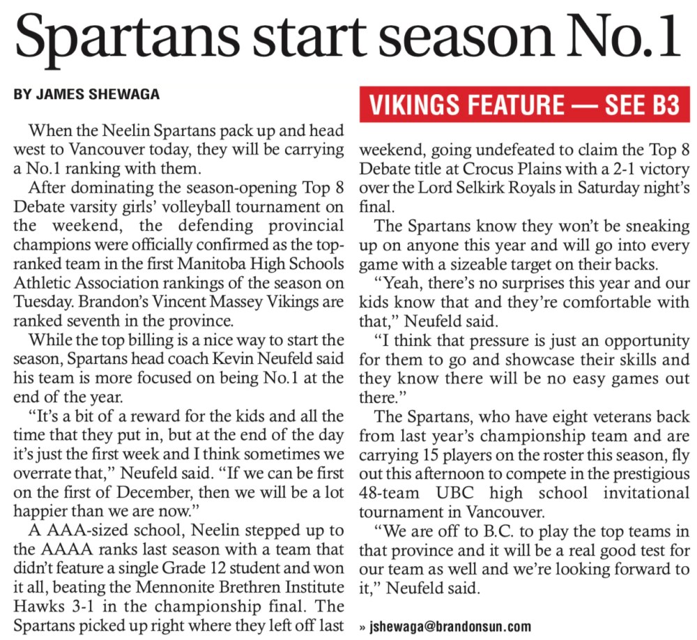 Setbacks aside, the Spartans cruised to win their first four tournaments, took their home Neelin Dig event and swept the Brandon High School league. They also turned heads well outside of Manitoba.