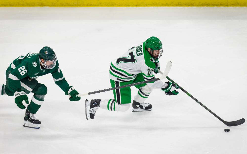 “I’ve made a lot of strides with my game since I came to Grand Forks,” Gaber said. “I’ve been working on a lot of things, especially with my skating and my shot, and I think that when you combine that with the things that people say are my strengths (work ethic and character) that’s allowed me to be successful at this level.