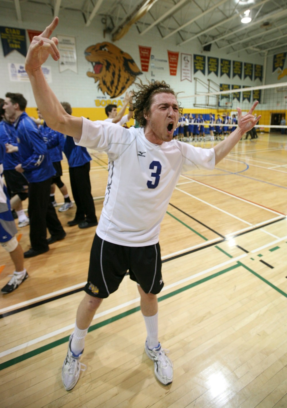 BU swept the UBC Thunderbirds in the conference quarterfinals on home court — including a 24-22 fifth-set victory in Match 2 to earn its first trip to nationals. Sanderson put up 21 kills, with Kevin Miller adding 15 and Small and Paul Robidoux recording 14 apiece.