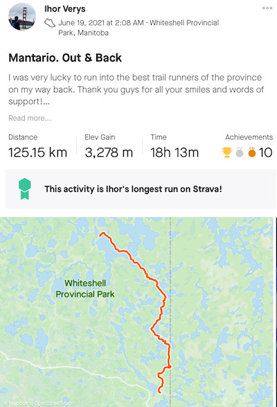 The 26-year-old Ukrainian runner, who spent the last six years in Brandon, set the fastest known time (FKT) recently for running the Mantario Trail from one end to the other and back, completing the 125.15-kilometre adventure in 18 hours 13 minutes on June 19.