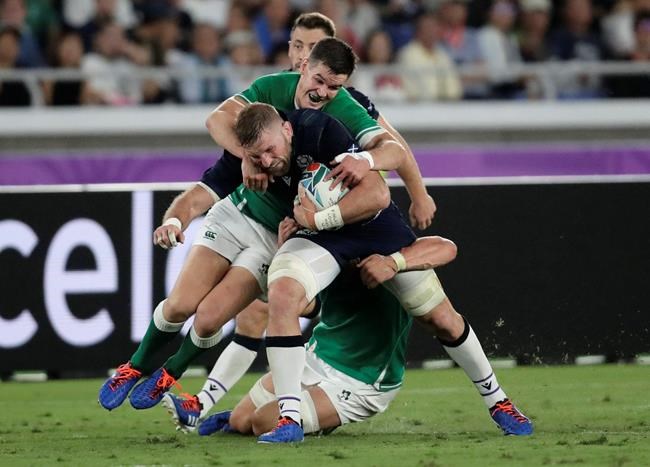 Scotland's John Barclay, centre, is tackled by Ireland's Josh van der Flier and Jonathan Sexton, left, during the Rugby World Cup Pool A game at International Stadium between Ireland and Scotland in Yokohama, Japan, Sunday, Sept. 22, 2019. (AP Photo/Jae Hong)