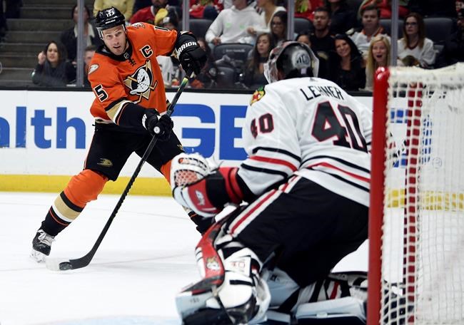 Anaheim Ducks center Ryan Getzlaf, left, attempts a shot while Chicago Blackhawks goalie Robin Lehner guards the goal during the second period of an NHL hockey game in Anaheim, Calif., Sunday, Nov. 3, 2019. (AP Photo/Kelvin Kuo)