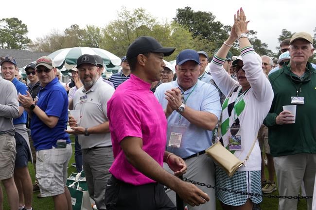 Wearing a pink shirt and black pants, Woods was greeted by thunderous applause when his name was announced to a huge gallery surrounding the first tee.
