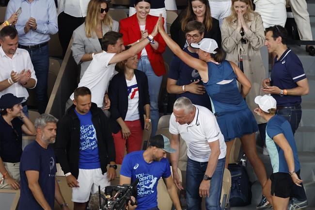 Poland's Iga Swiatek goes in the players box to celebrate with relative her victory over Coco Gauff of the U.S. during their final match of the French Open tennis tournament at the Roland Garros stadium Saturday, June 4, 2022 in Paris. Swiatek won 6-1, 6-3. (AP Photo/Jean-Francois Badias)