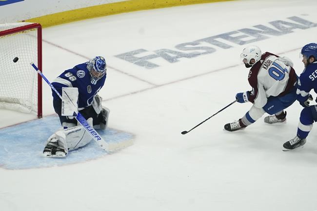 Colorado Avalanche center Nazem Kadri (91) shoots the puck past Tampa Bay Lightning goaltender Andrei Vasilevskiy (88) for a goal during overtime of Game 4 of the NHL hockey Stanley Cup Finals on Wednesday, June 22, 2022, in Tampa, Fla. (AP Photo/John Bazemore)