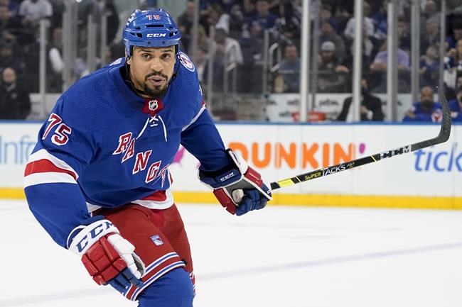 FILE -New York Rangers right wing Ryan Reaves (75) skates the ice in the first period of Game 2 of the NHL hockey Stanley Cup playoffs Eastern Conference finals against the Tampa Bay Lightning, Friday, June 3, 2022, in New York. The National Hockey League has taken significant strides in recent years to improve diversity in a sport that has long been predominantly white. (AP Photo/John Minchillo, File)