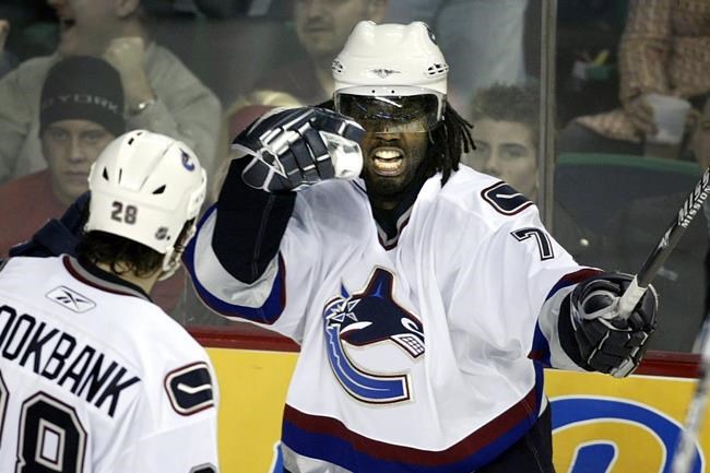 FILE - Vancouver Canucks' Anson Carter, right, celebrates his goal with teammates Wade Brookbank, left, during second period NHL hockey action against the Calgary Flames in Calgary, Tuesday, Feb. 28, 2006. Anson Carter remembers watching in high school as some of his friends abandoned hockey for being “too white