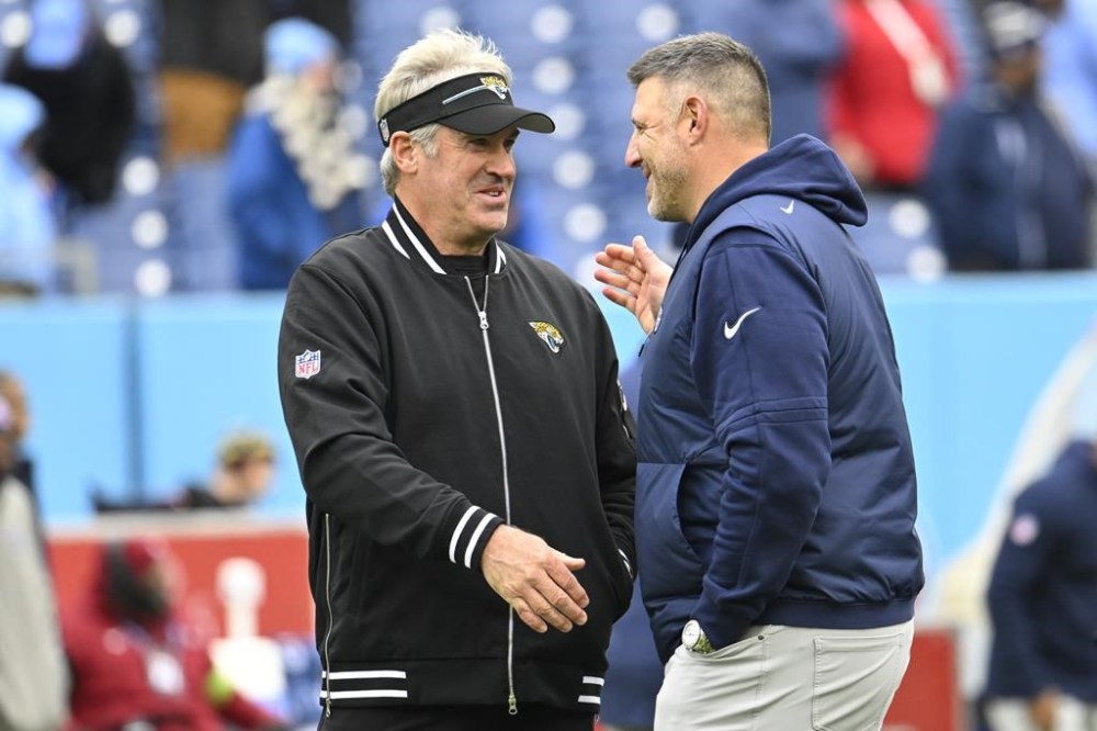 Jacksonville Jaguars head coach Doug Pederson, left, greets Tennessee Titans head coach Mike Vrabel, right, before an NFL football game Sunday, Jan. 7, 2024, in Nashville, Tenn. (AP Photo/John Amis)