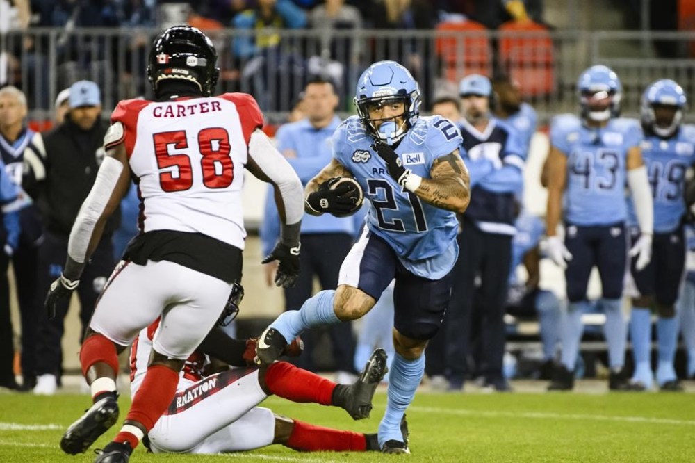 Toronto Argonauts running back Daniel Adeboboye (21) runs with the ball while defended by Ottawa Redblacks defensive lineman Bryce Carter (58) during first half CFL action, in Toronto, Saturday, Oct. 14, 2023. Carter is staying put. The American defensive lineman, who terrorized CFL quarterbacks last season, signed a one-year extension with the Ottawa Redblacks. THE CANADIAN PRESS/Christopher Katsarov