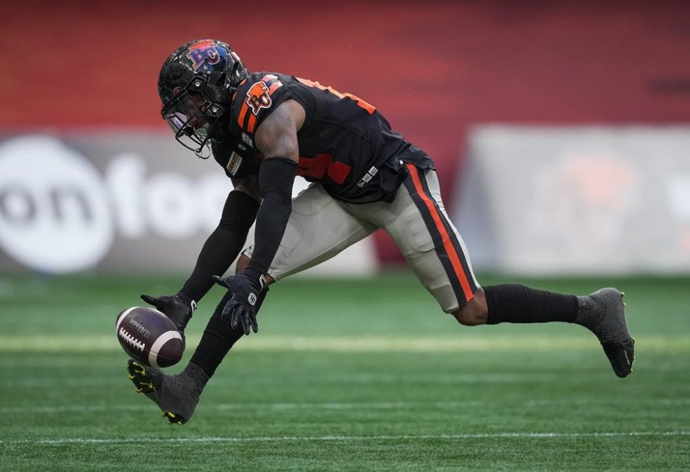 B.C. Lions' Marcus Sayles nearly intercepts a Montreal Alouettes pass during the second half of a CFL football game, in Vancouver, B.C., Sunday, July 9, 2023. THE CANADIAN PRESS/Darryl Dyck