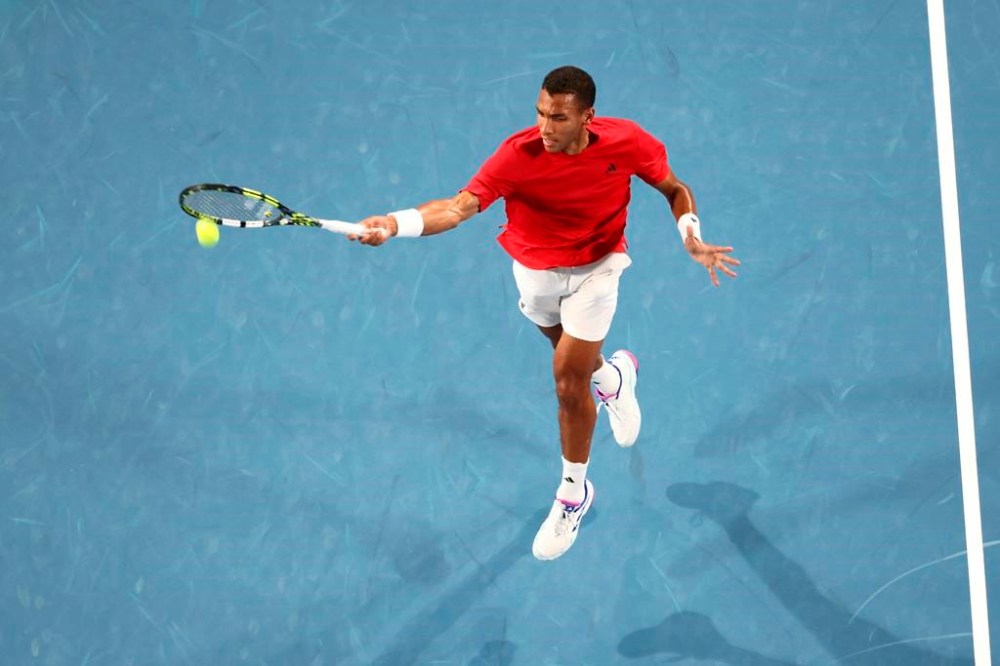 Felix Auger-Aliassime of Canada hits a return to Taylor Fritz of the United States during their United Cup tennis match in Perth, Australia, Sunday, Dec. 29, 2024. Felix Auger-Aliassime reached the semifinals of the Adelaide International with a straight sets win over Marcos Giron of the United States on Wednesday. THE CANADIAN PRESS/AP, Trevor Collens