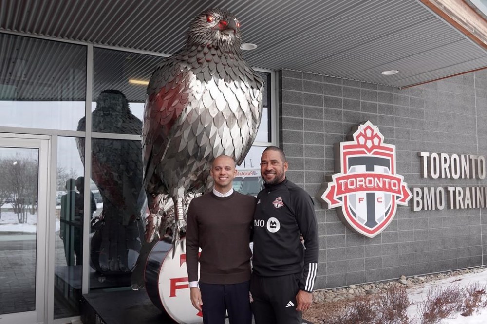 Toronto FC GM Jason Hernandez, left, and newly named head coach Robin Fraser pose in front of a statue of a giant hawk, the club mascot, outside the MLS club’s training centre, in Toronto, Wednesday, Jan. 15, 2025. The statue will eventually land at BMO Field, possibly with the slogan “Hunt for Glory.” THE CANADIAN PRESS/Neil Davidson