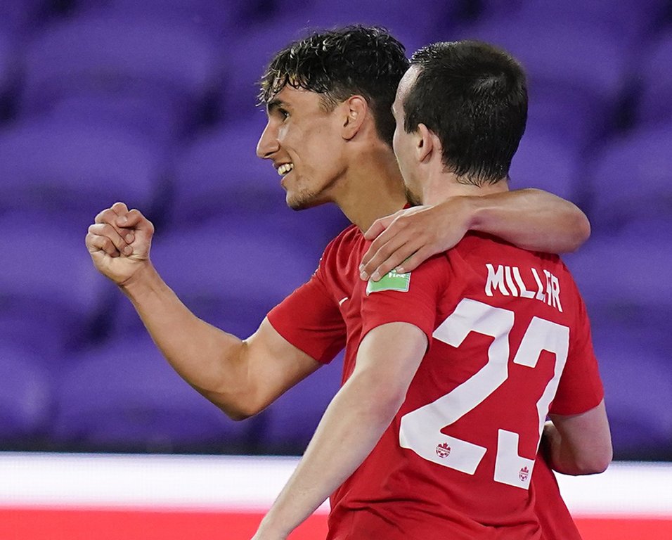 Canada midfielder Theo Corbeanu, left, celebrates his goal against Bermuda with forward Liam Millar (23) during the second half of a World Cup 2022 Group B qualifying soccer match Thursday, March 25, 2021, in Orlando, Fla. THE CANADIAN PRESS/AP-John Raoux
