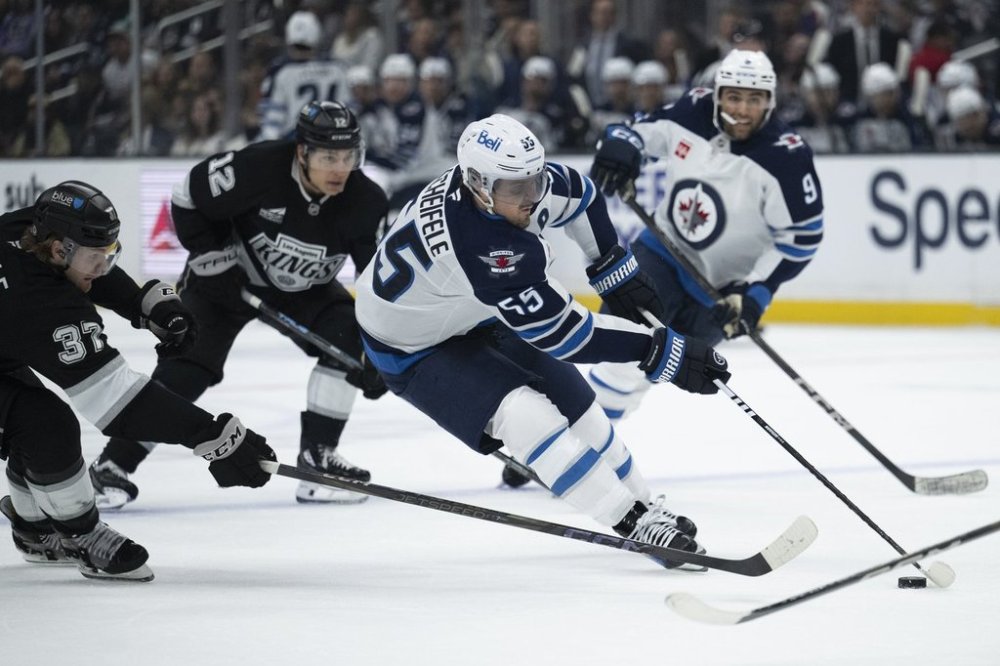 Winnipeg Jets centre Mark Scheifele (55) controls the puck past Los Angeles Kings left-winger Warren Foegele (37) during third period NHL hockey action, in Los Angeles, Tuesday, April 1, 2025. THE CANADIAN PRESS/AP-Kyusung Gong