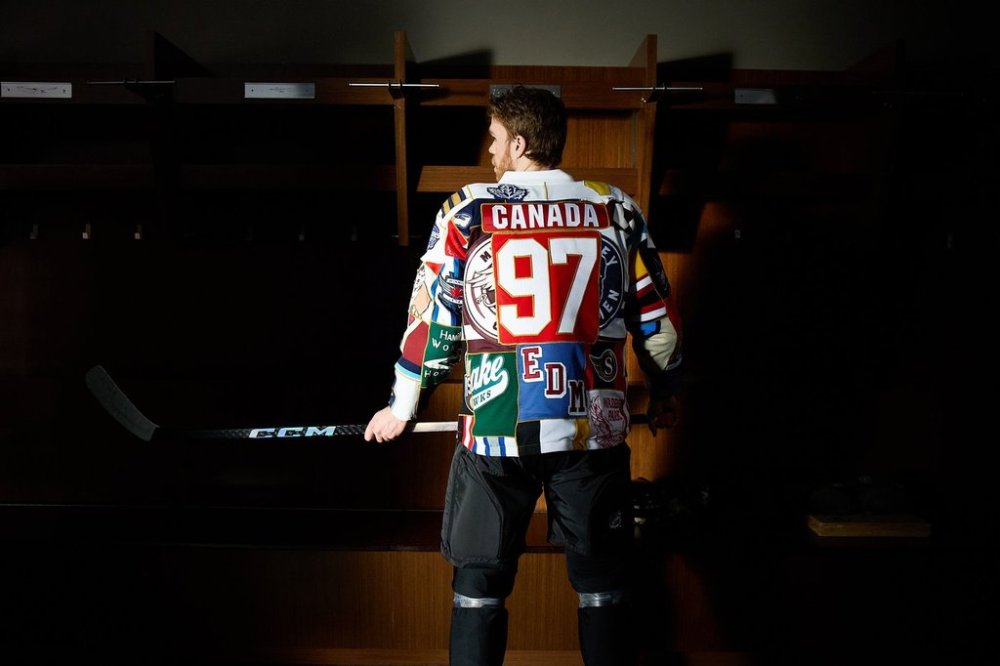 Donated jerseys from Canadians — including hockey superstars Connor McDavid and Marie-Philip Poulin — were used to create patchwork designs. The jersey was designed by Cameron Lizotte, a former OHL player who’s now a fashion designer.