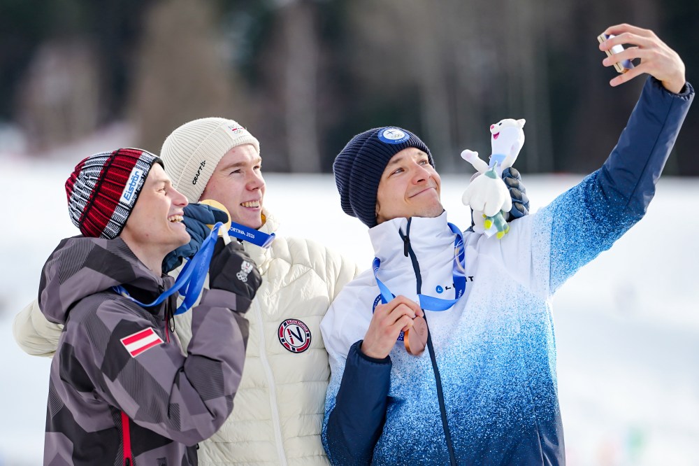 Silver medalist Johannes Lamparter, of Austria, from left, gold medalist Jens Luraas Oftebro, of Norway, and bronze medalist Eero Hirvonen, of Finland, pose for a selfie after the Nordic Combined Individual Gundersen Normal Hill/10km competition at the 2026 Winter Olympics, in Tesero, Italy, Wednesday, Feb. 11, 2026. (AP Photo/Matthias Schrader)