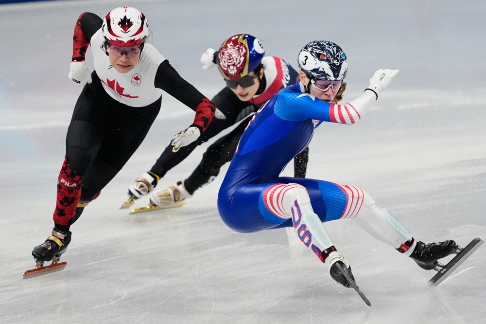 Corinne Stoddard, right, of the United States crashes as Courtney Sarault of Canada avoids her while competing in the team mixed relay short track speed skating at the 2026 Winter Olympics, in Milan, Italy, Tuesday, Feb. 10, 2026. (AP Photo/Ashley Landis)